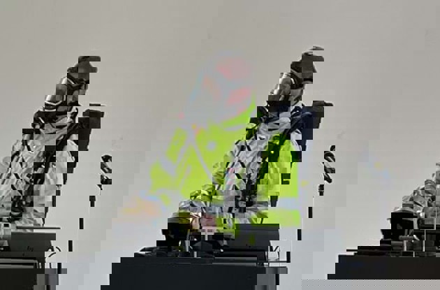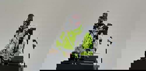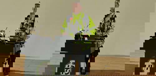 Præsentationen skete i form af en ”elevatorpitch” og Kenneth stod for vores del, sammen med Michael. Som det måske kan ses af billederne, var der rimelig stor fokus på vores indlæg, idet Kenneth startede op – på dansk – med røgdykkerudstyr monteret – og Michael svarede på tysk. Dette for at illustrere et af vores fokuspunkter i projektet, nemlig kommunikationen ved beredskabsmæssige assistancer på tværs af grænsen.